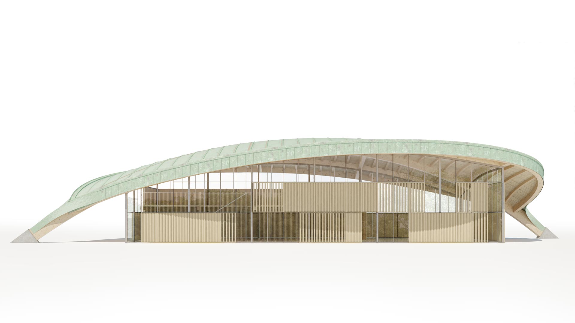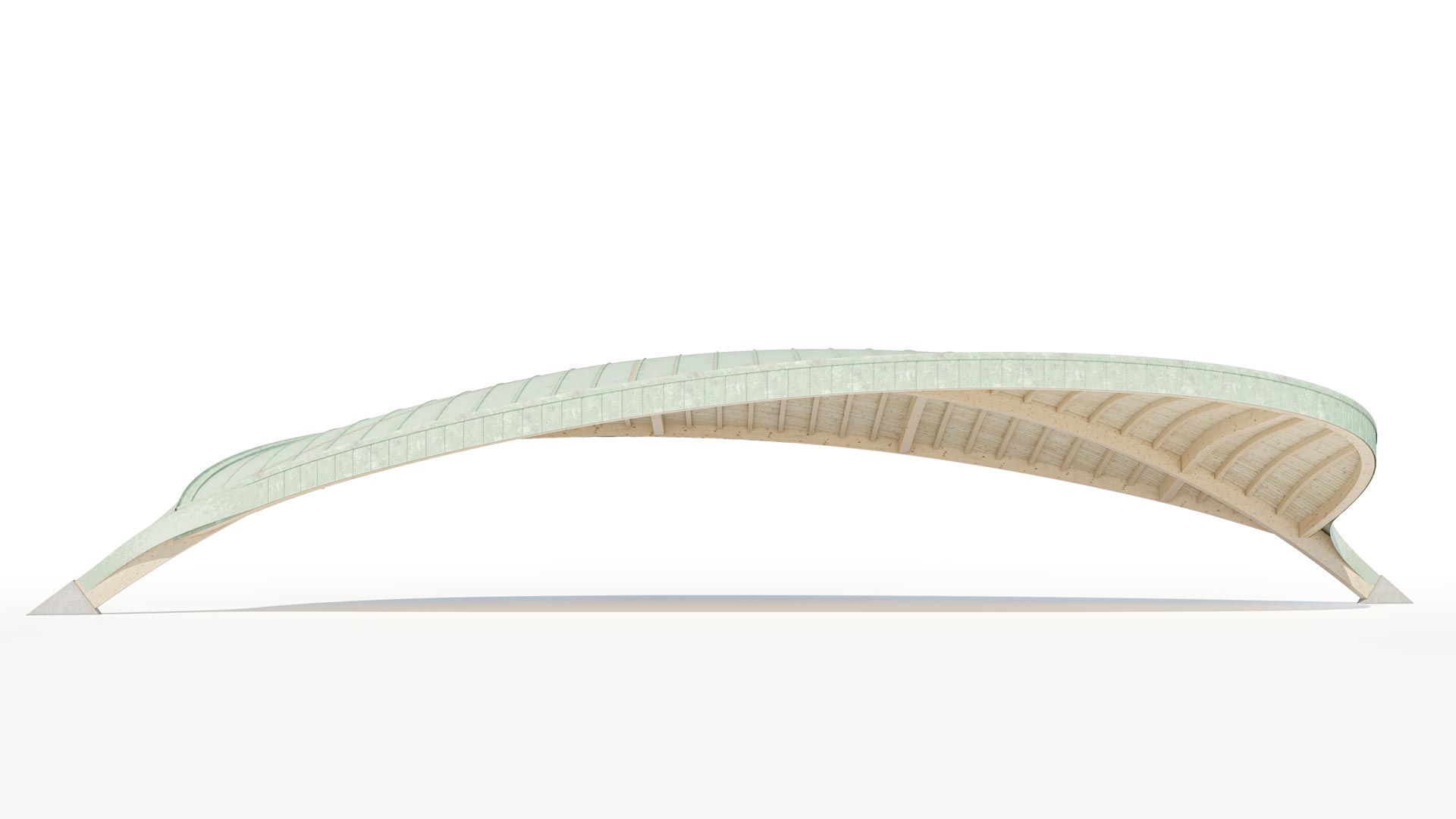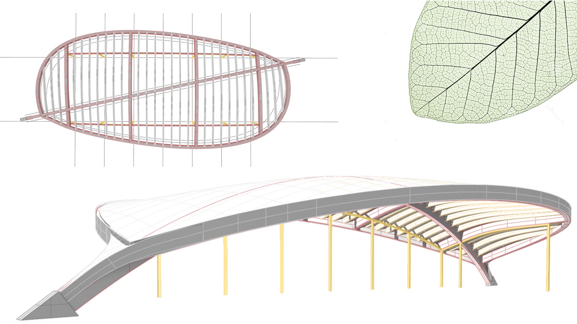 Also, the structure repeats the leaf composition, the arc represents “the stalk” and the cross beams the “veins”, the 50-meter Glulam arch is divided into the five parts connected to the other beams forming the skeleton of the leaf.