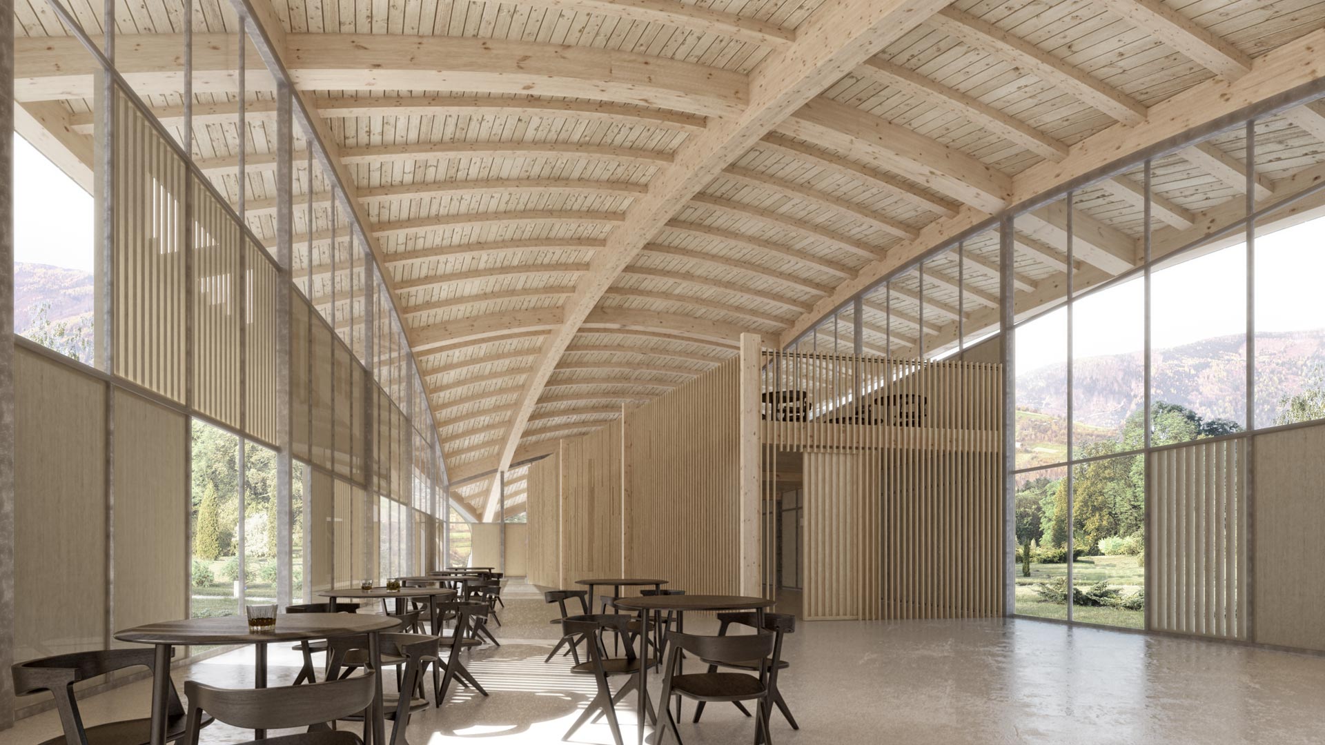The materials selection take us back to nature, almost the entire building is made of wood. Glulam combined with steel structure.